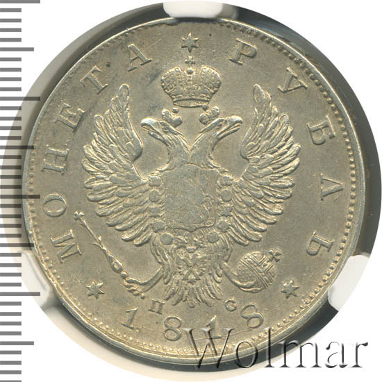 Динамика цен по монете 1 рубль 1818 СПБ ПС (Хвост растрепан, немного вытянут) XF1 рубль 1818 года СПБ-ПС. Хвост орла длиннее. Черта корочеДата выпуска: 01.01.1818 АверсВ центре изображен Государственный Герб Российской империи — двуглавый орёл с поднятыми вверх распущенными крыльями. Головы которого увенчаны двумя коронами, третья, большая корона над ними. На груди орла расположен Московский герб — щит с изображением Георгия Победоносца, поражающего копьем дракона. Вокруг щита орденская цепь с орденом Св. Апостола Андрея Первозванного. В правой лапе орла — скипетр, в левой — держава. Под правой лапой — буква «П», под левой — буква «С». Инициалы минцмейстера Павла Ступицына. Слева от герба круговая надпись — «МОНЕТА», справа — «РУБЛЬ». Под инициалами — дата выпуска монеты «1818». Все три надписи разделены между собой тремя шестиконечными звёздами. По окружности канта имеются рельефные элементы, выполненные в виде зубцов.РеверсВ центре надпись в четыре строки: «ЧИСТАГО"│"СЕРЕБРА"│"4 ЗОЛОТН."│"21 ДОЛЯ.». Над надписью — императорская корона. Под надписью — прямая черта, под ней — обозначение Санкт-Петербургского монетного двора «С.П.Б.». Вдоль канта, не доходя до короны, изображен венок из лавровой и дубовой ветви, которые в нижней части переплетены лентой. По окружности канта имеются рельефные элементы, выполненные в виде зубцов.Каталожные номера