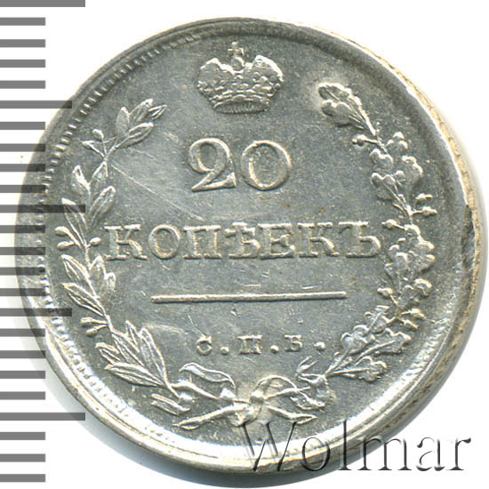 Динамика цен по монете 20 копеек 1819 СПБ ПС (Орел 1 типа) AU20 копеек 1819 года СПБ-ПСДата выпуска: 01.01.1819 АверсВ центре изображен Государственный Герб Российской империи — двуглавый орёл с поднятыми вверх распущенными крыльями. Головы которого увенчаны двумя коронами, третья, большая корона над ними. На груди орла расположен Московский герб — щит с изображением Георгия Победоносца, поражающего копьем дракона. Вокруг щита орденская цепь с орденом Св. Апостола Андрея Первозванного. В правой лапе орла — скипетр, в левой — держава. Под правой лапой — буква «П», под левой — буква «С». Инициалы минцмейстера Павла Ступицына. Под инициалами — дата выпуска монеты «1819.». По окружности канта имеются рельефные элементы, выполненные в виде зубцов.РеверсВ центре указан номинал — цифра «20». Над цифрой — Корона Российской империи. Под цифрой номинала — слово «КОПЕЕК». Под словом — прямая черта, под ней — обозначение Санкт-Петербургского монетного двора «С.П.Б.». Вдоль канта, не доходя до короны, изображен венок из лавровой и дубовой ветви, которые в нижней части переплетены лентой. По окружности канта имеются рельефные элементы, выполненные в виде зубцов.Каталожные номера