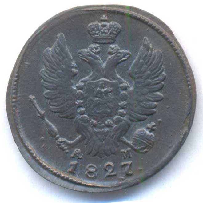 Динамика цен по монете 1 копейка 1827 КМ АМ (Орел 1810 г. Обычный.) XF1 копейка 1827 года КМ-АМДата выпуска: 01.01.1827 АверсВ центре изображен Государственный Герб Российской империи — двуглавый орёл с поднятыми вверх распущенными крыльями. Головы которого увенчаны двумя коронами, третья, большая корона над ними. На груди орла расположен Московский герб — щит с изображением Георгия Победоносца, поражающего копьем дракона. Вокруг щита орденская цепь с орденом Св. Апостола Андрея Первозванного. В правой лапе орла — скипетр, в левой — держава. Под правой лапой — буква «А», под левой — буква «М». Инициалы минцмейстера Андрея Мевиуса. Под инициалами — дата выпуска монеты «1827.». По окружности канта имеются рельефные элементы, выполненные в виде точек.РеверсВ центре указан номинал — цифра «1». Над цифрой — императорская корона. Под цифрой номинала — надпись «КОПЕЙКА». Под надписью — прямая черта, под ней — обозначение монетного двора «К.М.». Вдоль канта, не доходя до короны, изображен венок из лавровой и дубовой ветви, которые в нижней части переплетены лентой. По окружности канта имеются рельефные элементы, выполненные в виде точек.Каталожные номера
