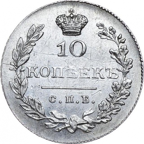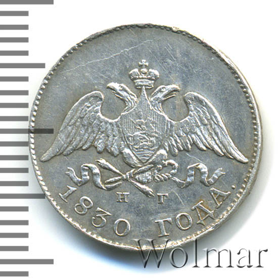 Динамика цен по монете 10 копеек 1830 СПБ НГ „Масонский Орел (Крылья вниз)“ AU10 копеек 1830 года СПБ-НГДата выпуска: 01.01.1830 АверсВ центре изображен Государственный Герб Российской империи — двуглавый орёл с распростёртыми и опущенными вниз крыльями. На груди орла расположен Московский герб — щит с изображением Георгия Победоносца, поражающего копьем дракона. Гербовый щит, над головами орла, венчает императорская корона. Орёл держит, перевитые орденской лентой ордена Св. Апостола Андрея Первозванного, громовые стрелы и факел в правой лапе и лавровый венок — в левой. Под лентой буквы: слева «Н», справа «Г». Инициалы минцмейстера Николая Грачева. Под инициалами — дата выпуска монеты «1830 ГОДА.». По окружности канта имеются рельефные элементы, выполненные в виде зубцов.РеверсВ центре указан номинал «10». Над цифрой — Корона Российской империи. Под цифрой номинала — слово «КОПЕЕК». Под словом — прямая черта, под ней — обозначение Санкт-Петербургского монетного двора «С.П.Б.». Вдоль канта, не доходя до короны, изображен венок из лавровой и дубовой ветви, которые в нижней части переплетены лентой. По окружности канта имеются рельефные элементы, выполненные в виде зубцов.Каталожные номера