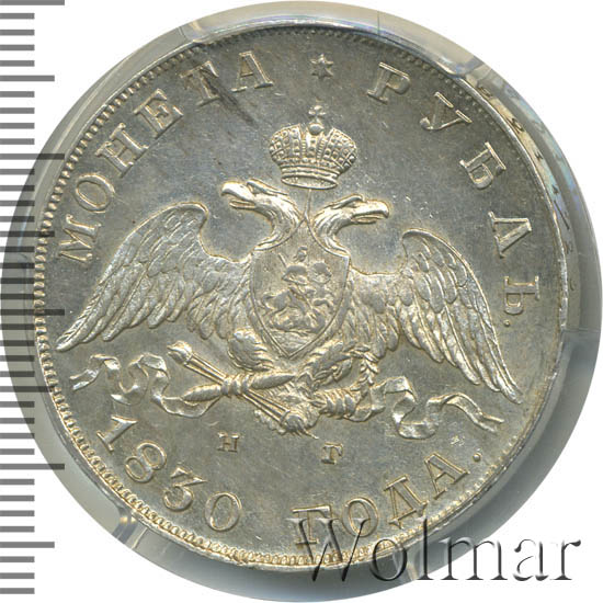 Динамика цен по монете 1 рубль 1830 СПБ НГ (Ленты длинные) „Масонский Орел (Крылья вниз)“ MS1 рубль 1830 года СПБ-НГ. Ленты длинныеДата выпуска: 01.01.1830 АверсВ центре изображен Государственный Герб Российской империи — двуглавый орёл с распростёртыми и опущенными вниз крыльями. На груди орла расположен Московский герб — щит с изображением Георгия Победоносца, поражающего копьем дракона. Гербовый щит, над головами орла, венчает императорская корона. Орёл держит, перевитые орденской лентой ордена Св. Апостола Андрея Первозванного, громовые стрелы и факел в правой лапе и лавровый венок — в левой. Под лентой буквы: слева «Н», справа «Г». Инициалы минцмейстера Николая Грачева. Над орлом обозначение номинала — круговая надпись «МОНЕТА РУБЛЬ.» разделённая шестиконечной звездой. Под орлом — дата выпуска монеты «1830 ГОДА.». По окружности канта имеются рельефные элементы, выполненные в виде зубцов.РеверсВ центре надпись в четыре строки: «ЧИСТАГО"│"СЕРЕБРА"│"4 ЗОЛОТН."│"21 ДОЛЯ.». Над надписью — императорская корона. Под надписью — прямая черта, под ней — обозначение Санкт-Петербургского монетного двора «С.П.Б.». Вдоль канта, не доходя до короны, изображен венок из лавровой и дубовой ветви, которые в нижней части переплетены лентой. По окружности канта имеются рельефные элементы, выполненные в виде зубцов.Каталожные номера