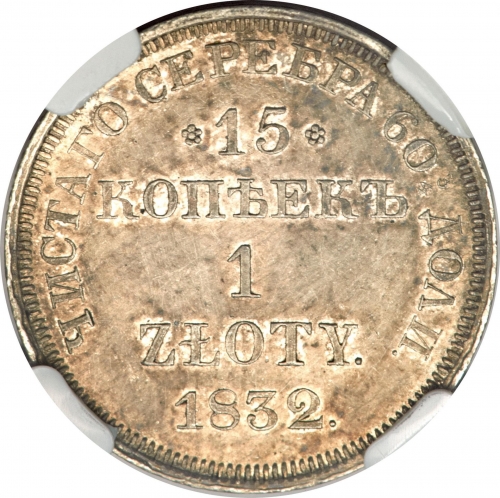 Динамика цен по монете 15 копеек/1 злотый 1832 НГ (Св. Георгий без плаща) „Русско-Польские монеты“ MS15 копеек — 1 злотый 1832 года НГ «Русско-польские». Св. Георгий без плащаДата выпуска: 01.01.1832 АверсВ центре изображен Государственный Герб Российской империи — двуглавый орёл, головы которого увенчаны двумя коронами, третья, большая корона над ними. На груди орла расположен Московский герб — щит с изображением Георгия Победоносца, поражающего копьем дракона. Вокруг щита орденская цепь с орденом Св. Апостола Андрея Первозванного. На крыльях изображены титульные гербы: на правом — Казанский, Астраханский и Сибирский, на левом — Польский, Таврический и Финляндский. В правой лапе орла — скипетр, в левой — держава. Под правой лапой — буква «Н», под левой — буква «Г». Инициалы минцмейстера Николая Грачева. По окружности канта имеются рельефные элементы, выполненные в виде зубцов.РеверсВ центре надпись в четыре строки: «15"│"КОПѢЕКЪ"│"1"│"ZLOTY.». Цифра «15» ограниченна с обеих сторон цветочными розетками. Под надписью дата выпуска — «1832.». Вдоль канта надпись: «ЧИСТАГО СЕРЕБРА 60 ¾ ДОЛИ.». По окружности канта имеются рельефные элементы, выполненные в виде зубцов.Каталожные номера