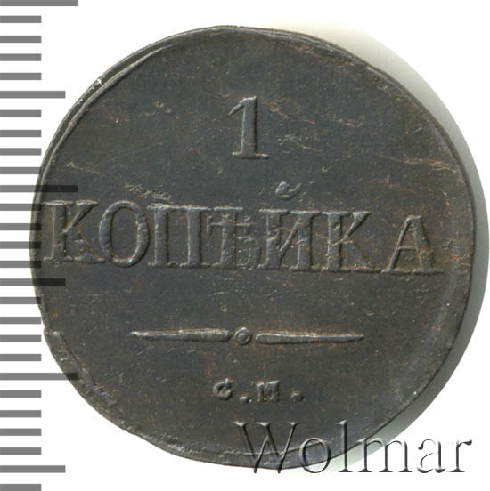 Динамика цен по монете 1 копейка 1832 СМ „Масонский Орел (Крылья вниз)“ AU1 копейка 1832 года СМДата выпуска: 01.01.1832 АверсВ центре изображен Государственный Герб Российской империи — двуглавый орёл с распростёртыми и опущенными вниз крыльями. Над головами орла — императорская корона. На груди орла расположен Московский герб — щит с изображением Георгия Победоносца, поражающего копьем дракона. Орёл держит, перевитые орденской лентой ордена Св. Апостола Андрея Первозванного, громовые стрелы и факел в правой лапе и лавровый венок — в левой. Под орлом — дата выпуска монеты «1832.».РеверсВ центре указан номинал «1». Под цифрой номинала — слово «КОПЕЙКА». Ниже, расположен декоративный разделитель в виде двух разнонаправленных линий и небольшой точки между ними. Ниже, под разделителем — обозначение монетного двора «С.М.».Каталожные номера