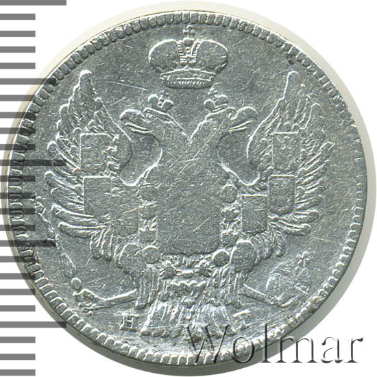 Динамика цен по монете 20 копеек 1832 СПБ НГ (Орел 1 типа) VF20 копеек 1832 года СПБ-НГДата выпуска: 01.01.1832 АверсВ центре изображен Государственный Герб Российской империи — двуглавый орёл, головы которого увенчаны двумя коронами, третья, большая корона над ними. На груди орла расположен Московский герб — щит с изображением Георгия Победоносца, поражающего копьем дракона. Вокруг щита орденская цепь с орденом Св. Апостола Андрея Первозванного. На крыльях изображены титульные гербы: на правом — Казанский, Астраханский и Сибирский, на левом — Польский, Таврический и Финляндский. В правой лапе орла — скипетр, в левой — держава. Под правой лапой — буква «Н», под левой — буква «Г». Инициалы минцмейстера Николая Грачева. По окружности канта имеются рельефные элементы, выполненные в виде зубцов.РеверсВ центре указан номинал «20». Над цифрой — Корона Российской империи. Под цифрой номинала — слово «КОПЕЕК». Ниже, расположен декоративный разделитель в виде двух разнонаправленных фигурных линий и небольшой окружности между ними, в центре которой, выпуклая точка. Под разделителем — дата выпуска монеты «1832». Под цифрой даты — обозначение монетного двора «С.П.Б.». Вдоль канта, не доходя до короны, изображен венок из лавровой и дубовой ветви, которые в нижней части перевязаны лентой на узел бантом. По окружности канта имеются рельефные элементы, выполненные в виде зубцов.Каталожные номера
