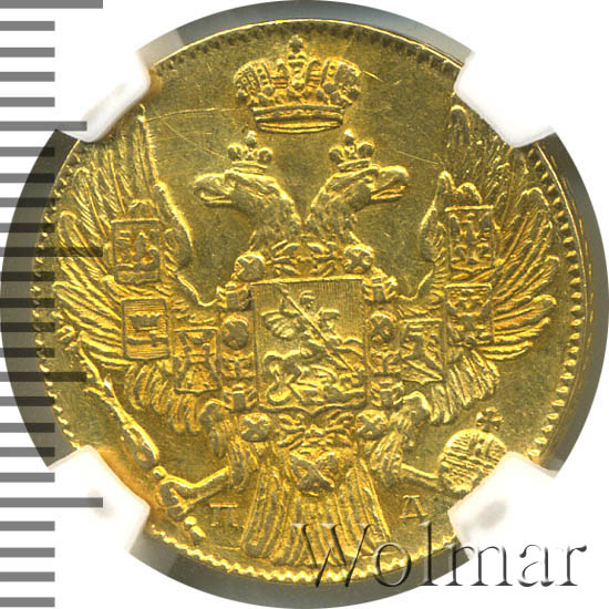 Динамика цен по монете 5 рублей 1833 СПБ ПД „Орел 1832 — 1843“ MS5 рублей 1833 года СПБ-ПДДата выпуска: 01.01.1833 АверсВ центре изображен Государственный Герб Российской империи — двуглавый орёл, головы которого увенчаны двумя коронами, третья, большая корона над ними. На груди орла расположен Московский герб, в щите изображен Георгий Победоносец с копьем поражающий дракона. Вокруг щита орденская цепь с орденом Св. Апостола Андрея Первозванного. На крыльях изображены титульные гербы: на правом — Казанский, Астраханский и Сибирский, на левом — Польский, Таврический и Финляндский. В правой лапе орла — скипетр, в левой — держава. Под правой лапой — буква «П», под левой — буква «Д». Инициалы минцмейстера Павла Данилова. По окружности канта имеются рельефные элементы, выполненные в виде зубцов.РеверсВ центре указан номинал «5», ограниченный с обеих сторон пятиконечными цветочными розетками. Под цифрой номинала — слово «РУБЛЕЙ». Ниже, расположен декоративный разделитель в виде двух разнонаправленных фигурных линий и точечной розетки между ними. Под разделителем — дата выпуска монеты «1833». Под цифрой даты — обозначение монетного двора «С.П.Б.». Центральная часть отделена от остального изображения, окружностью в виде точек. За окружностью круговая надпись: «ЧИСТОГО ЗОЛОТА 1 ЗОЛОТНИК 39 ДОЛЕЙ», разделенная сверху цветочной розеткой. По окружности канта имеются рельефные элементы, выполненные в виде зубцов.Каталожные номера