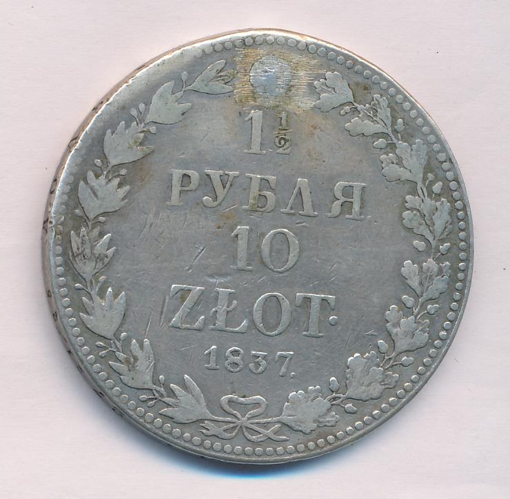Динамика цен по монете 1½ рубля/10 злотых 1837 МW „Русско-Польские монеты“ F1 ½ рубля — 10 злотых 1837 года MW «Русско-польские» (русско-польские)Дата выпуска: 01.01.1837 АверсВ центре изображен Государственный Герб Российской империи — двуглавый орёл, головы которого увенчаны двумя коронами, третья, большая корона над ними. На груди орла расположен Московский герб — щит с изображением Георгия Победоносца, поражающего копьем дракона. Вокруг щита орденская цепь с орденом Св. Апостола Андрея Первозванного. На крыльях изображены титульные гербы: на правом — Казанский, Астраханский и Сибирский, на левом — Польский, Таврический и Финляндский. В правой лапе орла — скипетр, в левой — держава. Под правой лапой — буква «M», под левой — буква «W». Обозначение Варшавского монетного двора. Центральная часть отделена от остального изображения, окружностью в виде точек. За окружностью круговая надпись: «ЧИСТАГО СЕРЕБРА 6 ЗОЛОТНИКОВЪ 31 ½ ДОЛЕЙ», разделенная сверху цветочной розеткой. По окружности канта имеются рельефные элементы, выполненные в виде точек.РеверсВ центре надпись в четыре строки: «1 ½"│"РУБЛЯ."│"10"│"ZLOT•". Под надписью дата выпуска монеты — «1837.». Вдоль канта изображен венок из лавровой и дубовой ветви, которые в нижней части перевязаны лентой на узел бантом. По окружности канта имеются рельефные элементы, выполненные в виде точек.Каталожные номера