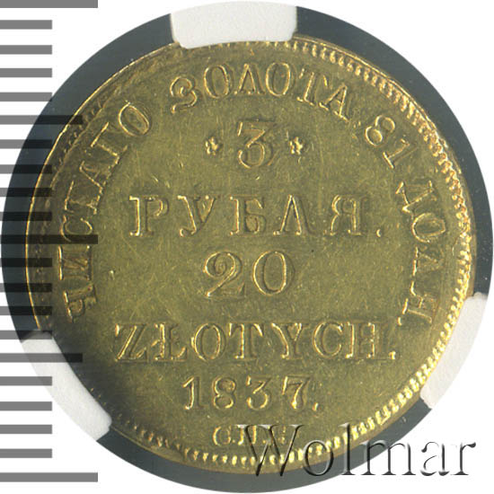 Динамика цен по монете 3 рубля/20 злотых 1837 СПБ ПД „Русско-Польские монеты“ AU3 рубля — 20 злотых 1837 года СПБ-ПД «Русско-польские» (русско-польские)Дата выпуска: 01.01.1837 АверсВ центре изображен Государственный Герб Российской империи — двуглавый орёл, головы которого увенчаны двумя коронами, третья, большая корона над ними. На груди орла расположен Московский герб, в щите изображен Георгий Победоносец с копьем поражающий дракона. Вокруг щита орденская цепь с орденом Св. Апостола Андрея Первозванного. На крыльях изображены титульные гербы: на правом — Казанский, Астраханский и Сибирский, на левом — Польский, Таврический и Финляндский. В правой лапе орла — скипетр, в левой — держава. Под правой лапой — буква «П», под левой — буква «Д». Инициалы минцмейстера Павла Данилова. По окружности канта имеются рельефные элементы, выполненные в виде зубцов.РеверсВ центре надпись в четыре строки: «3"│"РУБЛЯ."│"20"│"ZLOTYCH.». Цифра «3» ограниченна с обеих сторон цветочными розетками. Под надписью дата выпуска — «1837.» Под датой — буквы «С.П.Б.», обозначение Санкт-Петербургского монетного двора. В верхней части, вдоль канта, надпись: «ЧИСТАГО ЗОЛОТА 81 ДОЛЯ.». По окружности канта имеются рельефные элементы, выполненные в виде зубцов.Каталожные номера