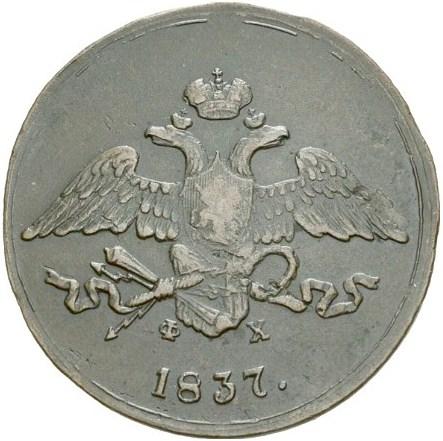 Динамика цен по монете 5 копеек 1837 ЕМ ФХ „Масонский Орел (Крылья вниз)“ XF5 копеек 1837 года ЕМ-ФХДата выпуска: 01.01.1837 АверсВ центре изображен Государственный Герб Российской империи — двуглавый орёл с распростёртыми и опущенными вниз крыльями. Над головами орла — императорская корона. На груди орла расположен Московский герб — щит с изображением Георгия Победоносца, поражающего копьем дракона. Орёл держит, перевитые орденской лентой ордена Св. Апостола Андрея Первозванного, громовые стрелы и факел в правой лапе и лавровый венок — в левой. Под лентой буквы: слева «Ф», справа «Х». Инициалы минцмейстера Федора Хвощинского. Под инициалами — дата выпуска монеты «1837.»РеверсВ центре указан номинал «5». Под цифрой номинала — слово «КОПЕЕК». Ниже, расположен декоративный разделитель в виде двух разнонаправленных линий и небольшой точки между ними. Ниже, под разделителем — обозначение монетного двора «Е.М.».Каталожные номера