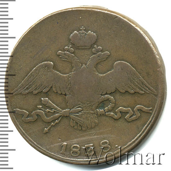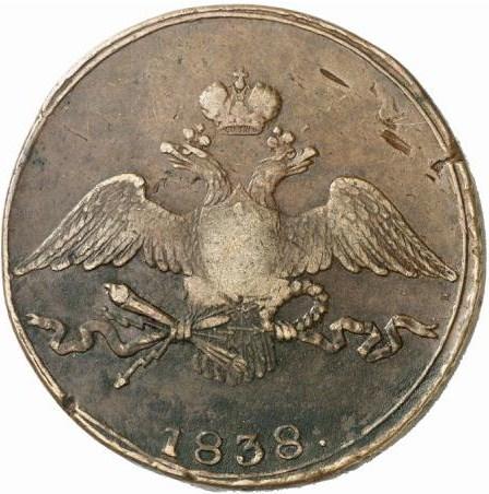 Динамика цен по монете 10 копеек 1838 СМ „Масонский Орел (Крылья вниз)“ XF10 копеек 1838 года СМДата выпуска: 01.01.1838 АверсВ центре изображен Государственный Герб Российской империи — двуглавый орёл с распростёртыми и опущенными вниз крыльями. Над головами орла — императорская корона. На груди орла расположен Московский герб — щит с изображением Георгия Победоносца, поражающего копьем дракона. Орёл держит, перевитые орденской лентой ордена Св. Апостола Андрея Первозванного, громовые стрелы и факел в правой лапе и лавровый венок — в левой. Под орлом — дата выпуска монеты «1838.».РеверсВ центре указан номинал — «10». Под цифрой номинала — слово «КОПЕЕК». Ниже, расположен декоративный разделитель в виде двух разнонаправленных линий и небольшой точки между ними. Ниже, под разделителем — обозначение монетного двора «С.М.».Каталожные номера