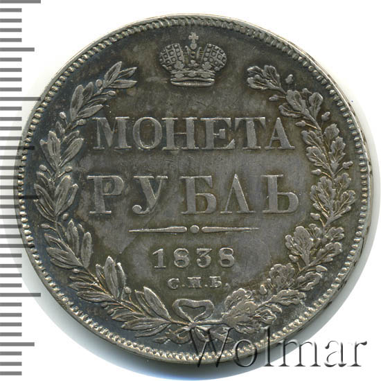 Динамика цен по монете 1 рубль 1838 СПБ НГ (Орел 3 типа) AU1 рубль 1838 года СПБ-НГДата выпуска: 01.01.1838 АверсВ центре изображен Государственный Герб Российской империи — двуглавый орёл, головы которого увенчаны двумя коронами, третья, большая корона над ними. На груди орла расположен Московский герб — щит с изображением Георгия Победоносца, поражающего копьем дракона. Вокруг щита орденская цепь с орденом Св. Апостола Андрея Первозванного. На крыльях изображены титульные гербы: на правом — Казанский, Астраханский и Сибирский, на левом — Польский, Таврический и Финляндский. В правой лапе орла — скипетр, в левой — держава. Под правой лапой — буква «Н», под левой — буква «Г». Инициалы минцмейстера Николая Грачева. Центральная часть отделена от остального изображения, окружностью в виде точек. За окружностью круговая надпись: «ЧИСТОГО СЕРЕБРА 4 ЗОЛОТНИКА 21 ДОЛЯ», разделенная сверху цветочной розеткой. По окружности канта имеются рельефные элементы, выполненные в виде зубцов.РеверсВ центре указан номинал «МОНЕТА РУБЛЬ» в две строки. Над номиналом — Корона Российской империи. Под номиналом расположен декоративный разделитель в виде двух разнонаправленных фигурных линий и небольшой окружности между ними, в центре которой, выпуклая точка. Под разделителем — дата выпуска монеты «1838». Под цифрой даты — обозначение монетного двора «С.П.Б.». Вдоль канта, не доходя до короны, изображен венок из лавровой и дубовой ветви, которые в нижней части перевязаны лентой на узел бантом. По окружности канта имеются рельефные элементы, выполненные в виде зубцов.Каталожные номера