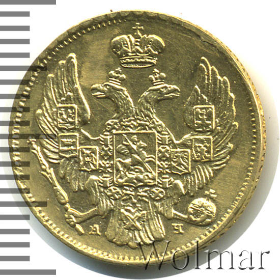 Динамика цен по монете 3 рубля/20 злотых 1839 СПБ АЧ „Русско-Польские монеты“ AU3 рубля — 20 злотых 1839 года СПБ-АЧ «Русско-польские» (русско-польские)Дата выпуска: 01.01.1839 АверсВ центре изображен Государственный Герб Российской империи — двуглавый орёл, головы которого увенчаны двумя коронами, третья, большая корона над ними. На груди орла расположен Московский герб, в щите изображен Георгий Победоносец с копьем поражающий дракона. Вокруг щита орденская цепь с орденом Св. Апостола Андрея Первозванного. На крыльях изображены титульные гербы: на правом — Казанский, Астраханский и Сибирский, на левом — Польский, Таврический и Финляндский. В правой лапе орла — скипетр, в левой — держава. Под правой лапой — буква «А», под левой — буква «Ч». Инициалы минцмейстера Алексея Чадова. По окружности канта имеются рельефные элементы, выполненные в виде зубцов.РеверсВ центре надпись в четыре строки: «3"│"РУБЛЯ."│"20"│"ZLOTYCH.». Цифра «3» ограниченна с обеих сторон цветочными розетками. Под надписью дата выпуска — «1839.» Под датой — буквы «С.П.Б.», обозначение Санкт-Петербургского монетного двора. В верхней части, вдоль канта, надпись: «ЧИСТАГО ЗОЛОТА 81 ДОЛЯ.». По окружности канта имеются рельефные элементы, выполненные в виде зубцов.Каталожные номера
