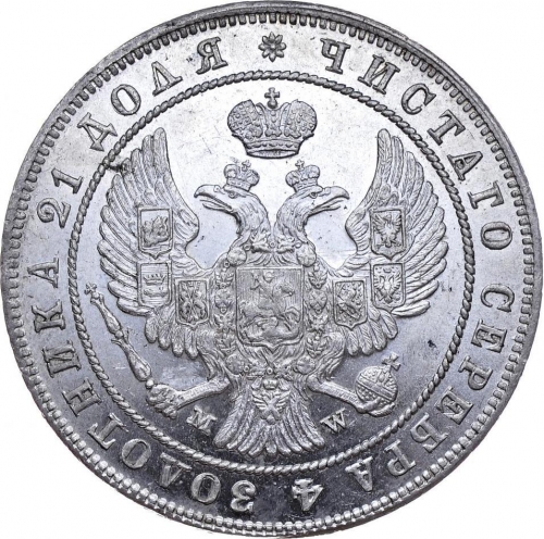 Динамика цен по монете 1 рубль 1846 МW (Орел 10 типа) MS1 рубль 1846 года MWДата выпуска: 01.01.1846 АверсВ центре изображен Государственный Герб Российской империи — двуглавый орёл, головы которого увенчаны двумя коронами, третья, большая корона над ними. На груди орла расположен Московский герб — щит с изображением Георгия Победоносца, поражающего копьем дракона. Вокруг щита орденская цепь с орденом Св. Апостола Андрея Первозванного. На крыльях изображены титульные гербы: на правом — Казанский, Астраханский и Сибирский, на левом — Польский, Таврический и Финляндский. В правой лапе орла — скипетр, в левой — держава. Под правой лапой — буква «M», под левой — буква «W». Обозначение Варшавского монетного двора. Центральная часть отделена от остального изображения, окружностью в виде точек. За окружностью круговая надпись: «ЧИСТОГО СЕРЕБРА 4 ЗОЛОТНИКА 21 ДОЛЯ», разделенная сверху цветочной розеткой. По окружности канта имеются рельефные элементы, выполненные в виде зубцов.РеверсВ центре указан номинал «МОНЕТА РУБЛЬ» в две строки. Над номиналом — Корона Российской империи. Под номиналом расположен декоративный разделитель в виде двух разнонаправленных фигурных линий и небольшой окружности между ними, в центре которой, выпуклая точка. Под разделителем — дата выпуска монеты «1846». Вдоль канта, не доходя до короны, изображен венок из лавровой и дубовой ветви, которые в нижней части перевязаны лентой на узел бантом. По окружности канта имеются рельефные элементы, выполненные в виде зубцов.Каталожные номера
