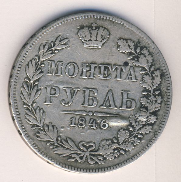 1 рубль 1846 года MWДата выпуска: 01.01.1846 АверсВ центре изображен Государственный Герб Российской империи — двуглавый орёл, головы которого увенчаны двумя коронами, третья, большая корона над ними. На груди орла расположен Московский герб — щит с изображением Георгия Победоносца, поражающего копьем дракона. Вокруг щита орденская цепь с орденом Св. Апостола Андрея Первозванного. На крыльях изображены титульные гербы: на правом — Казанский, Астраханский и Сибирский, на левом — Польский, Таврический и Финляндский. В правой лапе орла — скипетр, в левой — держава. Под правой лапой — буква «M», под левой — буква «W». Обозначение Варшавского монетного двора. Центральная часть отделена от остального изображения, окружностью в виде точек. За окружностью круговая надпись: «ЧИСТОГО СЕРЕБРА 4 ЗОЛОТНИКА 21 ДОЛЯ», разделенная сверху цветочной розеткой. По окружности канта имеются рельефные элементы, выполненные в виде зубцов.РеверсВ центре указан номинал «МОНЕТА РУБЛЬ» в две строки. Над номиналом — Корона Российской империи. Под номиналом расположен декоративный разделитель в виде двух разнонаправленных фигурных линий и небольшой окружности между ними, в центре которой, выпуклая точка. Под разделителем — дата выпуска монеты «1846». Вдоль канта, не доходя до короны, изображен венок из лавровой и дубовой ветви, которые в нижней части перевязаны лентой на узел бантом. По окружности канта имеются рельефные элементы, выполненные в виде зубцов.Каталожные номера