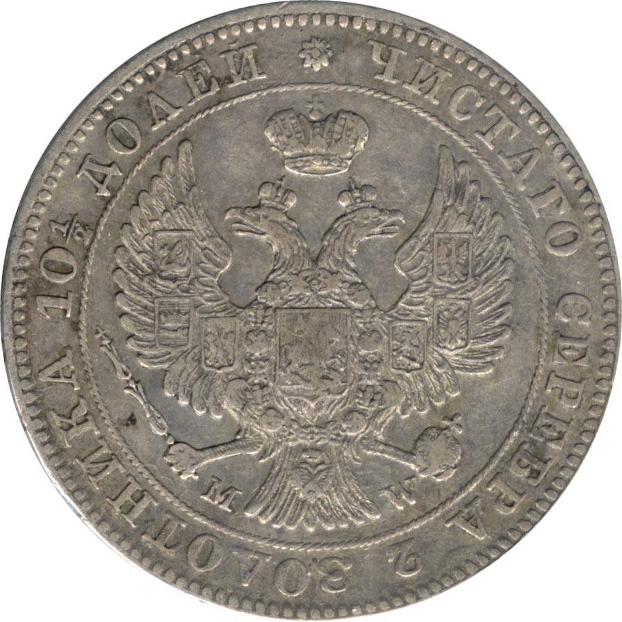Динамика цен по монете Полтина 1847 МW (Орел 7 типа. Корона и бант меньше) XFПолтина 1847 года MW. Корона и бант меньшеДата выпуска: 01.01.1847 АверсВ центре изображен Государственный Герб Российской империи — двуглавый орёл, головы которого увенчаны двумя коронами, третья, большая корона над ними. На груди орла расположен Московский герб — щит с изображением Георгия Победоносца, поражающего копьем дракона. Вокруг щита орденская цепь с орденом Св. Апостола Андрея Первозванного. На крыльях изображены титульные гербы: на правом — Казанский, Астраханский и Сибирский, на левом — Польский, Таврический и Финляндский. В правой лапе орла — скипетр, в левой — держава. Под правой лапой — буква «M», под левой — буква «W». Обозначение Варшавского монетного двора. Центральная часть отделена от остального изображения, окружностью в виде точек. За окружностью круговая надпись: «ЧИСТОГО СЕРЕБРА 2 ЗОЛОТНИКА 10 ½ ДОЛЕЙ», разделенная сверху цветочной розеткой. По окружности канта имеются рельефные элементы, выполненные в виде зубцов.РеверсВ центре указан номинал «МОНЕТА ПОЛТИНА» в две строки. Над номиналом — Корона Российской империи. Под номиналом расположен декоративный разделитель в виде двух разнонаправленных фигурных линий и небольшой окружности между ними, в центре которой, выпуклая точка. Под разделителем — дата выпуска монеты «1847». Вдоль канта, не доходя до короны, изображен венок из лавровой и дубовой ветви, которые в нижней части перевязаны лентой на узел бантом. По окружности канта имеются рельефные элементы, выполненные в виде зубцов.Каталожные номера