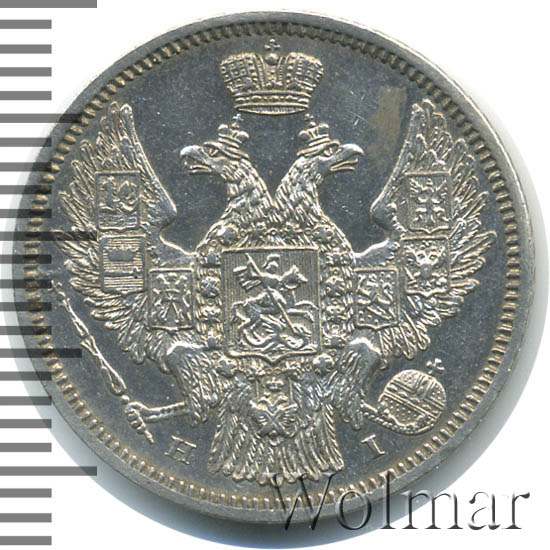 Динамика цен по монете 20 копеек 1848 СПБ НI (Орел 2 типа) MS20 копеек 1848 года СПБ-HI. Орел 2 типаДата выпуска: 01.01.1848 АверсВ центре изображен Государственный Герб Российской империи — двуглавый орёл, головы которого увенчаны двумя коронами, третья, большая корона над ними. На груди орла расположен Московский герб — щит с изображением Георгия Победоносца, поражающего копьем дракона. Вокруг щита орденская цепь с орденом Св. Апостола Андрея Первозванного. На крыльях изображены титульные гербы: на правом — Казанский, Астраханский и Сибирский, на левом — Польский, Таврический и Финляндский. В правой лапе орла — скипетр, в левой — держава. Под правой лапой — буква «Н», под левой — буква «I». Инициалы минцмейстера Николая Иоссы. По окружности канта имеются рельефные элементы, выполненные в виде зубцов.РеверсВ центре указан номинал «20». Над цифрой — Корона Российской империи. Под цифрой номинала — слово «КОПЕЕК». Ниже, расположен декоративный разделитель в виде двух разнонаправленных фигурных линий и небольшой окружности между ними, в центре которой, выпуклая точка. Под разделителем — дата выпуска монеты «1848». Под цифрой даты — обозначение монетного двора «С.П.Б.». Вдоль канта, не доходя до короны, изображен венок из лавровой и дубовой ветви, которые в нижней части перевязаны лентой на узел бантом. По окружности канта имеются рельефные элементы, выполненные в виде зубцов.Каталожные номера