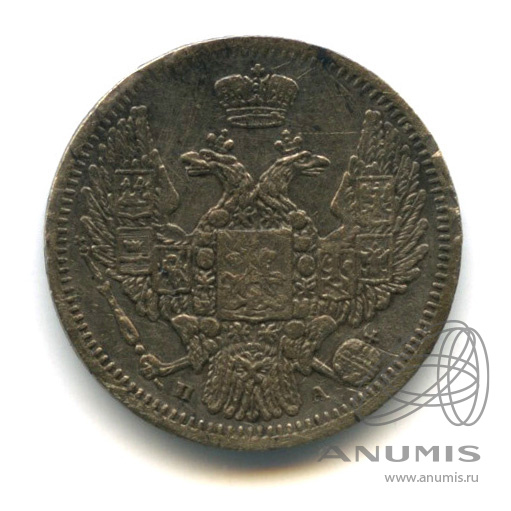 Динамика цен по монете 10 копеек 1849 СПБ ПА (Орел 4 типа. Корона уже) VF10 копеек 1849 года СПБ-ПА. Орел образца 1845 — 1848 г. Корона малаяДата выпуска: 01.01.1849 АверсВ центре изображен Государственный Герб Российской империи — двуглавый орёл, головы которого увенчаны двумя коронами, третья, большая корона над ними. На груди орла расположен Московский герб — щит с изображением Георгия Победоносца, поражающего копьем дракона. Вокруг щита орденская цепь с орденом Св. Апостола Андрея Первозванного. На крыльях изображены титульные гербы: на правом — Казанский, Астраханский и Сибирский, на левом — Польский, Таврический и Финляндский. В правой лапе орла — скипетр, в левой — держава. Под правой лапой — буква «П», под левой — буква «А». Инициалы минцмейстера Павла Алексеева. По окружности канта имеются рельефные элементы, выполненные в виде зубцов.РеверсВ центре указан номинал «10». Над цифрой — Корона Российской империи. Под цифрой номинала — слово «КОПЕЕК». Ниже, расположен декоративный разделитель в виде двух разнонаправленных фигурных линий и небольшой выпуклой точки между ними. Под разделителем — дата выпуска монеты «1849». Под цифрой даты — обозначение монетного двора «С.П.Б.». Вдоль канта, не доходя до короны, изображен венок из лавровой и дубовой ветви, которые в нижней части перевязаны лентой на узел бантом. По окружности канта имеются рельефные элементы, выполненные в виде зубцов.Каталожные номера
