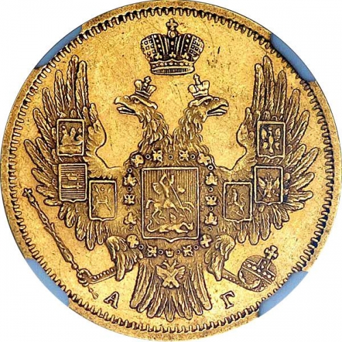 Динамика цен по монете 5 рублей 1850 СПБ АГ „Орел 1846 — 1850, Хвост шире, Корона больше“ AU5 рублей 1850 года СПБ-АГДата выпуска: 01.01.1850 АверсВ центре изображен Государственный Герб Российской империи — двуглавый орёл, головы которого увенчаны двумя коронами, третья, большая корона над ними. На груди орла расположен Московский герб, в щите изображен Георгий Победоносец с копьем поражающий дракона. Вокруг щита орденская цепь с орденом Св. Апостола Андрея Первозванного. На крыльях изображены титульные гербы: на правом — Казанский, Астраханский и Сибирский, на левом — Польский, Таврический и Финляндский. В правой лапе орла — скипетр, в левой — держава. Под правой лапой — буква «А», под левой — буква «Г». Инициалы минцмейстера Александра Гертова. По окружности канта имеются рельефные элементы, выполненные в виде зубцов.РеверсВ центре указан номинал «5», ограниченный с обеих сторон пятиконечными цветочными розетками. Под цифрой номинала — слово «РУБЛЕЙ». Ниже, расположен декоративный разделитель в виде двух разнонаправленных фигурных линий и небольшой выпуклой восьмиконечной звезды между ними. Под разделителем — дата выпуска монеты «1850». Под цифрой даты — обозначение монетного двора «С.П.Б.». Центральная часть отделена от остального изображения, окружностью в виде точек. За окружностью круговая надпись: «ЧИСТОГО ЗОЛОТА 1 ЗОЛОТНИК 39 ДОЛЕЙ», разделенная сверху цветочной розеткой. По окружности канта имеются рельефные элементы, выполненные в виде зубцов.Каталожные номера