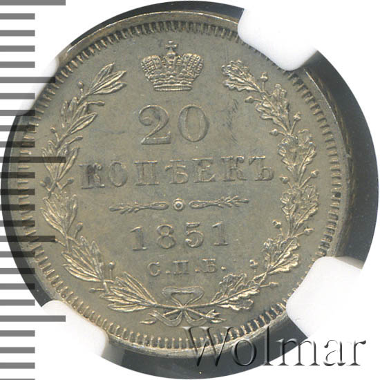 Динамика цен по монете 20 копеек 1851 СПБ ПА (Орел 3 типа) MS20 копеек 1851 года СПБ-ПАДата выпуска: 01.01.1851 АверсВ центре изображен Государственный Герб Российской империи — двуглавый орёл, головы которого увенчаны двумя коронами, третья, большая корона над ними. На груди орла расположен Московский герб — щит с изображением Георгия Победоносца, поражающего копьем дракона. Вокруг щита орденская цепь с орденом Св. Апостола Андрея Первозванного. На крыльях изображены титульные гербы: на правом — Казанский, Астраханский и Сибирский, на левом — Польский, Таврический и Финляндский. В правой лапе орла — скипетр, в левой — держава. Под правой лапой — буква «П», под левой — буква «А». Инициалы минцмейстера Павла Алексеева. По окружности канта имеются рельефные элементы, выполненные в виде зубцов.РеверсВ центре указан номинал «20». Над цифрой — Корона Российской империи. Под цифрой номинала — слово «КОПЕЕК». Ниже, расположен декоративный разделитель в виде двух разнонаправленных фигурных линий и небольшой окружности между ними, в центре которой, выпуклая точка. Под разделителем — дата выпуска монеты «1851». Под цифрой даты — обозначение монетного двора «С.П.Б.». Вдоль канта, не доходя до короны, изображен венок из лавровой и дубовой ветви, которые в нижней части перевязаны лентой на узел бантом. По окружности канта имеются рельефные элементы, выполненные в виде зубцов.Каталожные номера