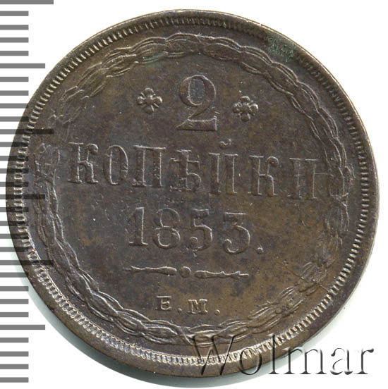 Динамика цен по монете 2 копейки 1853 ЕМ (Орел 1849 г.) AU2 копейки 1853 года ЕМДата выпуска: 01.01.1853 АверсВ центре изображен Государственный Герб Российской империи — двуглавый орёл, головы которого увенчаны двумя коронами, третья, большая корона над ними. На груди орла расположен Московский герб — щит с изображением Георгия Победоносца, поражающего копьем дракона. Вокруг щита орденская цепь с орденом Св. Апостола Андрея Первозванного. На крыльях изображены титульные гербы: на правом — Казанский, Астраханский и Сибирский, на левом — Польский, Таврический и Финляндский. В правой лапе орла — скипетр, в левой — держава. По окружности канта имеются рельефные элементы, выполненные в виде зубцов.РеверсВ центре указан номинал «2», ограниченный с обеих сторон цветочными розетками. Под цифрой номинала — слово «КОПЕЙКИ», под ним год выпуска монеты «1853.». Ниже, расположен декоративный разделитель в виде двух фигурных линий и небольшой точки между ними. Под разделителем обозначение монетного двора «Е.М.».По окружности, вдоль канта, декоративный венок вверху, внизу, справа и слева крестообразно перехваченный лентами. По окружности канта имеются рельефные элементы, выполненные в виде зубцов.Каталожные номера