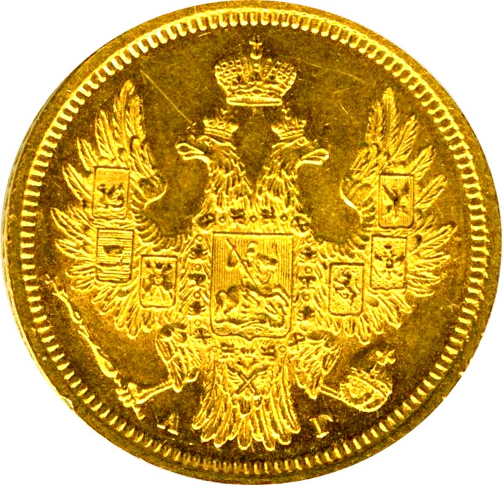 Динамика цен по монете 5 рублей 1854 СПБ АГ „Орел 1850 — 1858, Хвост «Елочкой»“ AU5 рублей 1854 года СПБ-АГДата выпуска: 01.01.1854 АверсВ центре изображен Государственный Герб Российской империи — двуглавый орёл, головы которого увенчаны двумя коронами, третья, большая корона над ними. На груди орла расположен Московский герб, в щите изображен Георгий Победоносец с копьем поражающий дракона. Вокруг щита орденская цепь с орденом Св. Апостола Андрея Первозванного. На крыльях изображены титульные гербы: на правом — Казанский, Астраханский и Сибирский, на левом — Польский, Таврический и Финляндский. В правой лапе орла — скипетр, в левой — держава. Под правой лапой — буква «А», под левой — буква «Г». Инициалы минцмейстера Александра Гертова. По окружности канта имеются рельефные элементы, выполненные в виде зубцов.РеверсВ центре указан номинал «5», ограниченный с обеих сторон пятиконечными цветочными розетками. Под цифрой номинала — слово «РУБЛЕЙ». Ниже, расположен декоративный разделитель в виде двух разнонаправленных фигурных линий и небольшой выпуклой восьмиконечной звезды между ними. Под разделителем — дата выпуска монеты «1854». Под цифрой даты — обозначение монетного двора «С.П.Б.». Центральная часть отделена от остального изображения, окружностью в виде точек. За окружностью круговая надпись: «ЧИСТОГО ЗОЛОТА 1 ЗОЛОТНИК 39 ДОЛЕЙ», разделенная сверху цветочной розеткой. По окружности канта имеются рельефные элементы, выполненные в виде зубцов.Каталожные номера