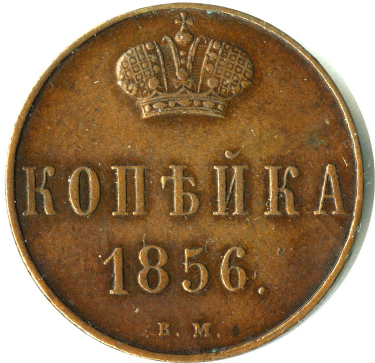 87 проходов1 копейка 1856 ВМ (Вензель шире) „Вензель Александра II“. |
