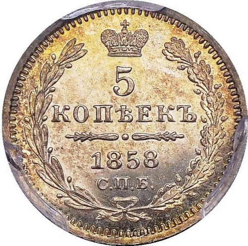5 копеек 1858 года СПБ-ФБДата выпуска: 01.01.1858 АверсВ центре изображен Государственный Герб Российской империи — двуглавый орёл, головы которого увенчаны двумя коронами, третья, большая корона над ними. На груди орла расположен Московский герб, в щите изображен Георгий Победоносец с копьем поражающий дракона. Вокруг щита орденская цепь Св. Апостола Андрея Первозванного. На крыльях изображены титульные гербы: на правом — Казанский, Астраханский и Сибирский, на левом — Польский, Таврический и Финляндский. В правой лапе орла — скипетр, в левой — держава. Под правой лапой — буква «Ф», под левой — буква «Б». Инициалы минцмейстера Федора Блюма. По окружности канта имеются рельефные элементы, выполненные в виде зубцов.РеверсВ центре указан номинал «5». Над цифрой — Корона Российской империи. Под цифрой номинала — слово «КОПЕЕК». Ниже, расположен декоративный разделитель в виде двух разнонаправленных фигурных линий и небольшой выпуклой точки между ними. Под разделителем — дата выпуска монеты «1858». Под цифрой даты — обозначение монетного двора «С.П.Б.». Вдоль канта, не доходя до короны, изображен венок из лавровой и дубовой ветви, которые в нижней части перевязаны лентой на узел бантом. По окружности канта имеются рельефные элементы, выполненные в виде зубцов.Каталожные номера