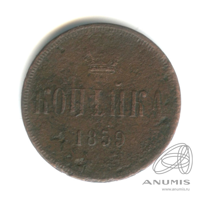 Динамика цен по монете 1 копейка 1859 ЕМ (Корона меньше) „Вензель Александра II“ F1 копейка 1859 года ЕМ. Корона ужеДата выпуска: 01.01.1859 АверсВ центре вензель Александра II. Над ним Корона Российской империи.РеверсВ центе обозначение номинала — слово «КОПЕЙКА». Выше номинала — Корона Российской империи. Ниже номинала — год выпуска монеты «1859.» и под годом — обозначение монетного двора буквы «Е.М.».Каталожные номера