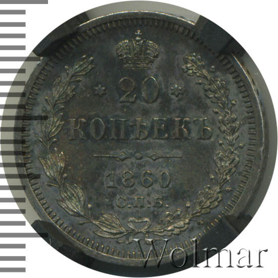 Динамика цен по монете 20 копеек 1860 СПБ ФБ (Орел 1 типа) MS20 копеек 1860 года СПБ-ФБ. Орел образца 1859 г.Дата выпуска: 01.01.1860 АверсВ центре изображен Малый Государственный Герб Российской империи — двуглавый орёл, головы которого увенчаны двумя коронами, третья, большая корона над ними. Все они соединены орденской лентой ордена Св. Апостола Андрея Первозванного. На груди орла расположен Московский герб, в щите изображен Георгий Победоносец с копьем поражающий дракона. Вокруг щита цепь ордена Св. Апостола Андрея Первозванного. На крыльях изображены гербы: Царства Казанского, Польского, Херсонеса Таврического, Астраханского, Сибирского, Грузинского и герб соединенных княжеств Киевского, Новгородского и Владимирского — по 4 на каждое крыло. В правой лапе орла — скипетр, в левой — держава. Под правой лапой — буква «Ф», под левой — буква «Б». Инициалы минцмейстера Федора Блюма. По окружности канта имеются рельефные элементы, выполненные в виде зубцов.РеверсВ центре указан номинал «20», ограниченный с обеих сторон шестиконечными звездочками. Над цифрой — Корона Российской империи. Под цифрой номинала — слово «КОПЕЕК». Ниже, расположен декоративный разделитель в виде двух разнонаправленных фигурных линий и стилизованным из точек крестом между ними. Под разделителем — дата выпуска монеты «1860». Под цифрой даты — обозначение монетного двора «С.П.Б.». Вдоль канта, не доходя до короны, изображен венок из лавровой и дубовой ветви, которые в нижней части перевязаны лентой на узел бантом. По окружности канта имеются рельефные элементы, выполненные в виде зубцов.Каталожные номера
