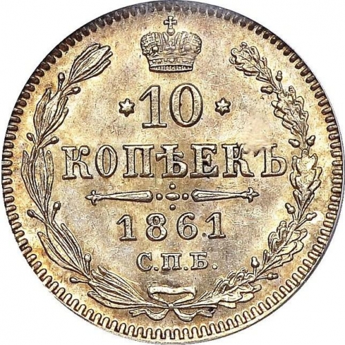 Динамика цен по монете 10 копеек 1861 СПБ (Орел нового типа. Гурт - точки) MS10 копеек 1861 года СПБ (точки на гурте)Дата выпуска: 01.01.1861 АверсВ центре изображен Малый Государственный Герб Российской империи — двуглавый орёл, головы которого увенчаны двумя коронами, третья, большая корона над ними. Все они соединены орденской лентой ордена Св. Апостола Андрея Первозванного. На груди орла расположен Московский герб, в щите изображен Георгий Победоносец с копьем поражающий дракона. Вокруг щита цепь ордена Св. Апостола Андрея Первозванного. На крыльях изображены гербы: Царства Казанского, Польского, Херсонеса Таврического, Астраханского, Сибирского, Грузинского и герб соединенных княжеств Киевского, Новгородского и Владимирского — по 4 на каждое крыло. В правой лапе орла — скипетр, в левой — держава. По окружности канта имеются рельефные элементы, выполненные в виде зубцов.РеверсВ центре указан номинал «10», ограниченный с обеих сторон шестиконечными звездочками. Над цифрой — Корона Российской империи. Под цифрой номинала — слово «КОПЕЕК». Ниже, расположен декоративный разделитель в виде двух разнонаправленных фигурных линий и стилизованным из точек крестом между ними. Под разделителем — дата выпуска монеты «1861». Под цифрой даты — обозначение монетного двора «С.П.Б.». Вдоль канта, не доходя до короны, изображен венок из лавровой и дубовой ветви, которые в нижней части перевязаны лентой на узел бантом. По окружности канта имеются рельефные элементы, выполненные в виде зубцов.Каталожные номера