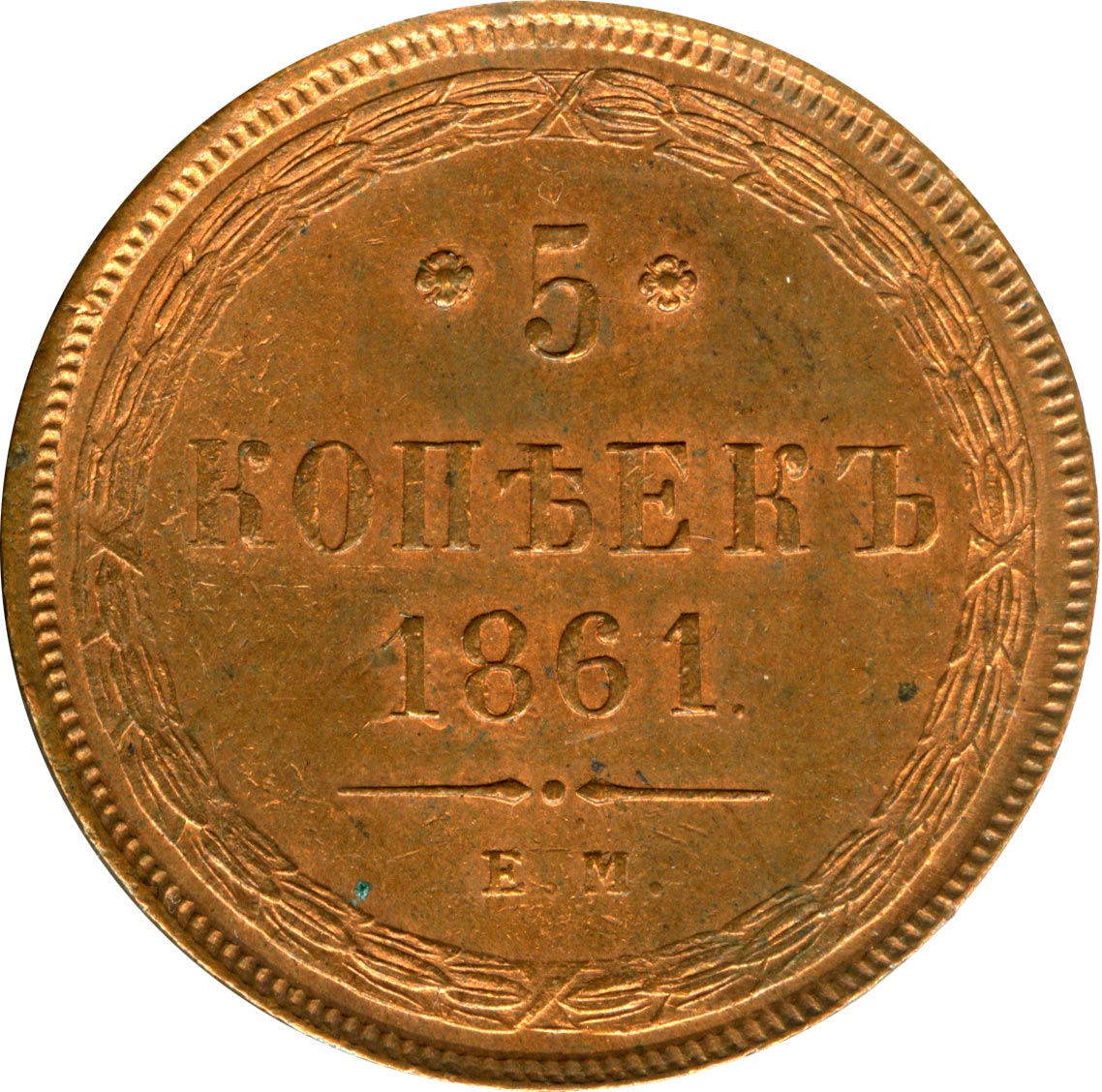 Динамика цен по монете 5 копеек 1861 ЕМ (Орел 1859 г.) AU5 копеек 1861 года ЕМДата выпуска: 01.01.1861 АверсВ центре изображен Малый Государственный Герб Российской империи — двуглавый орёл, головы которого увенчаны двумя коронами, третья, большая корона над ними. На груди орла расположен Московский герб — щит с изображением Георгия Победоносца, поражающего копьем дракона. Вокруг щита орденская цепь с орденом Св. Апостола Андрея Первозванного. На крыльях изображены гербы: Царства Казанского, Польского, Херсонеса Таврического, Астраханского, Сибирского, Грузинского и герб соединенных княжеств Киевского, Новгородского и Владимирского — по 4 на каждое крыло. В правой лапе орла — скипетр, в левой — держава.РеверсВ центре указан номинал «5», ограниченный с обеих сторон цветочными розетками. Под цифрой номинала слово — «КОПЕЕК», под ним год выпуска монеты «1861.». Ниже, расположен декоративный разделитель в виде двух фигурных линий и небольшой точки между ними. Под разделителем обозначение монетного двора «Е.М.».По окружности, вдоль канта, декоративный венок вверху, внизу, справа и слева крестообразно перехваченный лентами.Каталожные номера