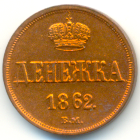Динамика цен по монете Денежка 1862 ВМ „Вензель Александра II“ MSДенежка 1862 года ВМДата выпуска: 01.01.1862 АверсВ центре вензель Александра II. Над ним Корона Российской империи.РеверсВ центе обозначение номинала — слово «ДЕНЕЖКА». Выше — Корона Российской империи. Ниже — год выпуска монеты «1862.» и под годом — обозначение монетного двора буквы «В.М.».Каталожные номера