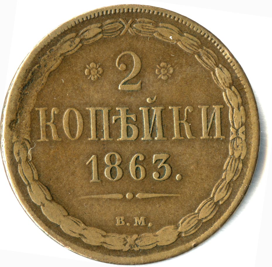 Динамика цен по монете 2 копейки 1863 ВМ (Орел 1861 г. Варшава.) VF2 копейки 1863 года ВМДата выпуска: 01.01.1863 АверсВ центре изображен Малый Государственный Герб Российской империи — двуглавый орёл, головы которого увенчаны двумя коронами, третья, большая корона над ними. На груди орла расположен Московский герб — щит с изображением Георгия Победоносца, поражающего копьем дракона. Вокруг щита орденская цепь с орденом Св. Апостола Андрея Первозванного. На крыльях изображены гербы: Царства Казанского, Польского, Херсонеса Таврического, Астраханского, Сибирского, Грузинского и герб соединенных княжеств Киевского, Новгородского и Владимирского — по 4 на каждое крыло. В правой лапе орла — скипетр, в левой — держава.РеверсВ центре указан номинал «2», ограниченный с обеих сторон цветочными розетками. Под цифрой номинала слово — «КОПЕЙКИ», под ним год выпуска монеты «1863.». Ниже, расположен декоративный разделитель в виде двух фигурных линий и небольшой точки между ними. Под разделителем обозначение монетного двора «В.М.».По окружности, вдоль канта, декоративный венок вверху, внизу, справа и слева крестообразно перехваченный лентами.Каталожные номера