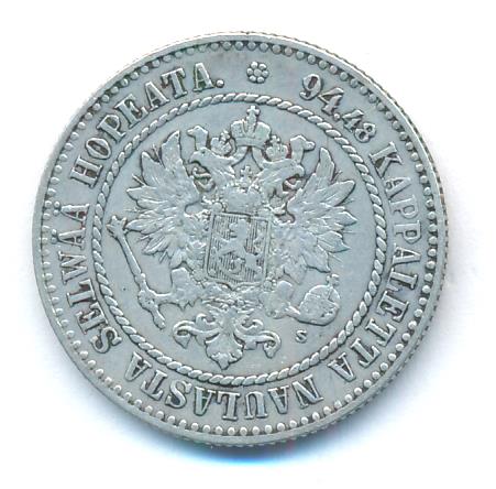 Динамика цен по монете 1 марка 1864 S „Для Финляндии“ F1 марка 1864 года SДата выпуска: 01.01.1864 АверсВ центре изображён полный Герб Великого княжества Финляндского — двуглавый орёл, головы которого увенчаны двумя коронами, третья, большая корона над ними. Все они соединены орденской лентой ордена Св. Апостола Андрея Первозванного. На груди орла расположен щит с титульным гербом Великого князя Финляндского, увенчанный княжеской короной. Вокруг щита орденская цепь с орденом Св. Апостола Андрея Первозванного. В правой лапе орла — скипетр, в левой — держава. Под левой лапой знак директора Гельсингфосского монетного двора — литера «S», August Frederick Soldan (Август Фридрих Сольдан). Вокруг центрального изображения — витой ободок. За ободком круговая надпись: «94.48 KAPPALETTA NAULASTA SELWÄÄ HOPEATA», сверху разделённая цветочной розеткой. По окружности канта имеются рельефные элементы, выполненные в виде зубцов.РеверсВ центре — надпись в три строки: «1"│"MARKAA"│"1864». Вдоль канта изображён не замкнутый венок из двух дубовых ветвей, которые, в нижней части, перевязаны лентой на узел двойным бантом. По окружности канта имеются рельефные элементы, выполненные в виде зубцов.Каталожные номера