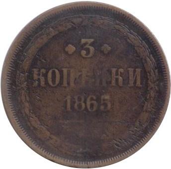 3 копейки 1865 года ЕМДата выпуска: 01.01.1865 АверсВ центре изображен Малый Государственный Герб Российской империи — двуглавый орёл, головы которого увенчаны двумя коронами, третья, большая корона над ними. На груди орла расположен Московский герб — щит с изображением Георгия Победоносца, поражающего копьем дракона. Вокруг щита орденская цепь с орденом Св. Апостола Андрея Первозванного. На крыльях изображены гербы: Царства Казанского, Польского, Херсонеса Таврического, Астраханского, Сибирского, Грузинского и герб соединенных княжеств Киевского, Новгородского и Владимирского — по 4 на каждое крыло. В правой лапе орла — скипетр, в левой — держава.РеверсВ центре указан номинал «3», ограниченный с обеих сторон цветочными розетками. Под цифрой номинала слово — «КОПЕЙКИ», под ним год выпуска монеты «1865.». Ниже, расположен декоративный разделитель в виде двух фигурных линий и небольшой точки между ними. Под разделителем обозначение монетного двора «Е.М.».По окружности, вдоль канта, декоративный венок вверху, внизу, справа и слева крестообразно перехваченный лентами.Каталожные номера