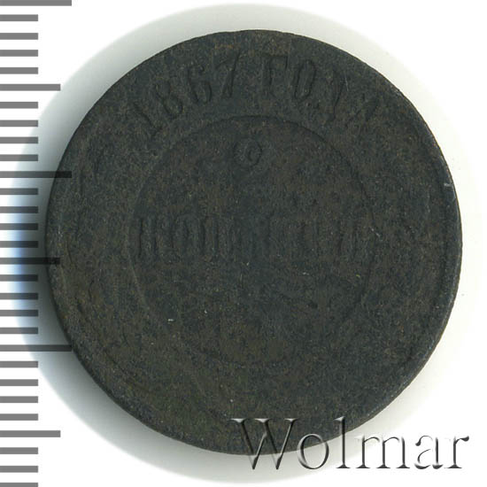 Динамика цен по монете 2 копейки 1867 ЕМ F2 копейки 1867 года ЕМ новый типДата выпуска: 01.01.1867 АверсВ центре монеты изображен Малый Государственный Герб Российской империи — двуглавый орел, головы которого увенчаны двумя коронами, третья, большая корона над ними. Все они соединены лентой Андрея Первозванного. В правой лапе орла — скипетр, в левой — держава. На его груди расположен Московский герб, в щите изображен Георгий Победоносец с копьем поражающий дракона. Вокруг щита цепь ордена Св. Апостола Андрея Первозванного. На крыльях орла изображены гербы: Царства Казанского, Польского, Херсонеса Таврического, Астраханского, Сибирского, Грузинского и герб соединенных княжеств Киевского, Новгородского и Владимирского — по 4 на каждое крыло. По окружности — две полукруглые плашки, соединенные узорами. На верхней плашке выпуклая надпись: «МЕДНАЯ РОССИЙСКАЯ МОНЕТА». На нижней плашке, изображенной в виде ленты, углубленная надпись: «ДВЕ КОПЕЙКИ».РеверсВ центре указан номинал «2», ограниченный с обеих сторон звездочками. Под цифрой номинала слово — «КОПЕЙКИ». Ниже, расположен декоративный разделитель в виде двух изогнутых линий и небольшой окружности между ними. Под линиями обозначение монетного двора «Е.М.». Центральная часть отделена от остального изображения, окружностью в виде точек. В верхней части по кругу углубленная надпись: «1867 ГОДА». Ниже этой надписи, вдоль канта, изображен венок из лавровой и дубовой ветви, которые в нижней части перевязаны лентой на узел бантом.Каталожные номера