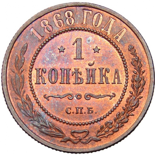 Динамика цен по монете 1 копейка 1868 СПБ MS1 копейка 1868 года СПБДата выпуска: 01.01.1868 АверсВ центре монеты изображен Малый Государственный Герб Российской империи — двуглавый орел, головы которого увенчаны двумя коронами, третья, большая корона над ними. Все они соединены лентой Андрея Первозванного. В правой лапе орла — скипетр, в левой — держава. На его груди расположен Московский герб, в щите изображен Георгий Победоносец с копьем поражающий дракона. Вокруг щита цепь ордена Св. Апостола Андрея Первозванного. На крыльях орла изображены гербы: Царства Казанского, Польского, Херсонеса Таврического, Астраханского, Сибирского, Грузинского и герб соединенных княжеств Киевского, Новгородского и Владимирского — по 4 на каждое крыло. По окружности — две полукруглые плашки, соединенные узорами. На верхней плашке выпуклая надпись: «МЕДНАЯ РОССИЙСКАЯ МОНЕТА». На нижней плашке, изображенной в виде ленты, углубленная надпись: «ОДНА КОПЕЙКА».РеверсВ центре указан номинал «1», ограниченный с обеих сторон звездочками. Под цифрой номинала слово — «КОПЕЙКА». Ниже, расположен декоративный разделитель в виде двух изогнутых линий и небольшой окружности между ними. Под линиями обозначение монетного двора «С.П.Б.». Центральная часть отделена от остального изображения, окружностью в виде точек. В верхней части по кругу углубленная надпись: «1868 ГОДА». Ниже этой надписи, вдоль канта, изображен венок из лавровой и дубовой ветви, которые в нижней части перевязаны лентой на узел бантом.Каталожные номера
