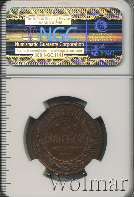 3 копейки 1869 года СПБДата выпуска: 01.01.1869 АверсВ центре монеты изображен Малый Государственный Герб Российской империи — двуглавый орел, головы которого увенчаны двумя коронами, третья, большая корона над ними. Все они соединены лентой Андрея Первозванного. В правой лапе орла — скипетр, в левой — держава. На его груди расположен Московский герб, в щите изображен Георгий Победоносец с копьем поражающий дракона. Вокруг щита цепь ордена Св. Апостола Андрея Первозванного. На крыльях орла изображены гербы: Царства Казанского, Польского, Херсонеса Таврического, Астраханского, Сибирского, Грузинского и герб соединенных княжеств Киевского, Новгородского и Владимирского — по 4 на каждое крыло. По окружности — две полукруглые плашки, соединенные узорами. На верхней плашке выпуклая надпись: «МЕДНАЯ РОССИЙСКАЯ МОНЕТА». На нижней плашке, изображенной в виде ленты, углубленная надпись: «ТРИ КОПЕЙКИ».РеверсВ центре указан номинал «3», ограниченный с обеих сторон звездочками. Под цифрой номинала слово — «КОПЕЙКИ». Ниже, расположен декоративный разделитель в виде двух изогнутых линий и небольшой окружности между ними. Под линиями обозначение монетного двора «С.П.Б.». Центральная часть отделена от остального изображения, окружностью в виде точек. В верхней части по кругу углубленная надпись: «1869 ГОДА». Ниже этой надписи, вдоль канта, изображен венок из лавровой и дубовой ветви, которые в нижней части перевязаны лентой на узел бантом.Каталожные номера