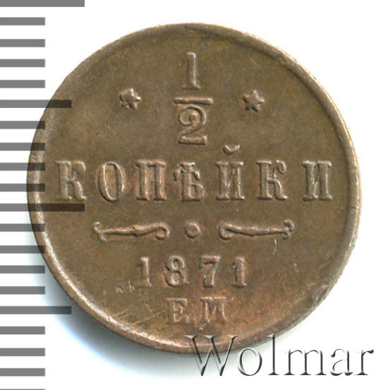 Динамика цен по монете ½ копейки 1871 ЕМ „Вензель Александра II“ XF½ копейки 1871 года ЕМДата выпуска: 01.01.1871 АверсВ центре вензель Александра II. Над ним Корона Российской империи с двумя развевающимися концами ленты Ордена Святого апостола Андрея Первозванного. Под вензелем, вдоль канта, две скрещенные ветви: слева лавровая, справа дубовая.РеверсВ центре указан номинал «½», ограниченный с обеих сторон звездочками. Под цифрой номинала слово — «КОПЕЙКИ». Ниже, расположен декоративный разделитель в виде двух изогнутых линий и небольшой окружности между ними. Под линиями год выпуска монеты «1871» и под ним обозначение монетного двора «Е.М.».Каталожные номера