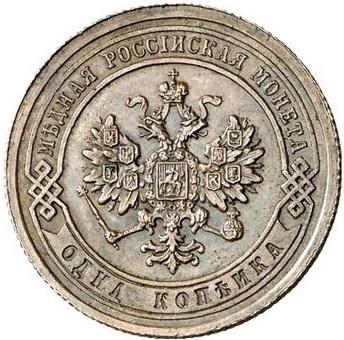 1 копейка 1871 года СПБДата выпуска: 01.01.1871 АверсВ центре монеты изображен Малый Государственный Герб Российской империи — двуглавый орел, головы которого увенчаны двумя коронами, третья, большая корона над ними. Все они соединены лентой Андрея Первозванного. В правой лапе орла — скипетр, в левой — держава. На его груди расположен Московский герб, в щите изображен Георгий Победоносец с копьем поражающий дракона. Вокруг щита цепь ордена Св. Апостола Андрея Первозванного. На крыльях орла изображены гербы: Царства Казанского, Польского, Херсонеса Таврического, Астраханского, Сибирского, Грузинского и герб соединенных княжеств Киевского, Новгородского и Владимирского — по 4 на каждое крыло. По окружности — две полукруглые плашки, соединенные узорами. На верхней плашке выпуклая надпись: «МЕДНАЯ РОССИЙСКАЯ МОНЕТА». На нижней плашке, изображенной в виде ленты, углубленная надпись: «ОДНА КОПЕЙКА».РеверсВ центре указан номинал «1», ограниченный с обеих сторон звездочками. Под цифрой номинала слово — «КОПЕЙКА». Ниже, расположен декоративный разделитель в виде двух изогнутых линий и небольшой окружности между ними. Под линиями обозначение монетного двора «С.П.Б.». Центральная часть отделена от остального изображения, окружностью в виде точек. В верхней части по кругу углубленная надпись: «1871 ГОДА». Ниже этой надписи, вдоль канта, изображен венок из лавровой и дубовой ветви, которые в нижней части перевязаны лентой на узел бантом.Каталожные номера