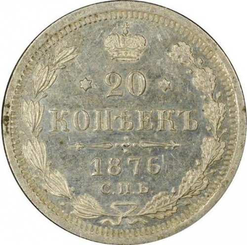 Динамика цен по монете 20 копеек 1876 СПБ НI (Орел 4 типа) AU20 копеек 1876 года СПБ-HIДата выпуска: 01.01.1876 АверсВ центре изображен Малый Государственный Герб Российской империи — двуглавый орёл, головы которого увенчаны двумя коронами, третья, большая корона над ними. Все они соединены орденской лентой ордена Св. Апостола Андрея Первозванного. На груди орла расположен Московский герб — щит с изображением Георгия Победоносца, поражающего копьем дракона. Вокруг щита цепь ордена Св. Апостола Андрея Первозванного. На крыльях изображены гербы: Царства Казанского, Польского, Херсонеса Таврического, Астраханского, Сибирского, Грузинского и герб соединенных княжеств Киевского, Новгородского и Владимирского — по 4 на каждое крыло. В правой лапе орла — скипетр, в левой — держава. Под правой лапой — буква «Н», под левой — буква «I». Инициалы минцмейстера Николая Иоссы. По окружности канта имеются рельефные элементы, выполненные в виде зубцов.РеверсВ центре указан номинал — «20», ограниченный с обеих сторон шестиконечными звездочками. Над цифрой — Корона Российской империи. Под цифрой номинала — слово «КОПЕЕК». Ниже, расположен декоративный разделитель в виде двух разнонаправленных фигурных линий и стилизованным из точек крестом между ними. Под разделителем — дата выпуска монеты «1876». Под цифрой даты — обозначение монетного двора «С.П.Б.». Вдоль канта, не доходя до короны, изображен венок из лавровой и дубовой ветви, которые, в нижней части, перевязаны лентой на узел бантом. По окружности канта имеются рельефные элементы, выполненные в виде зубцов.Каталожные номера
