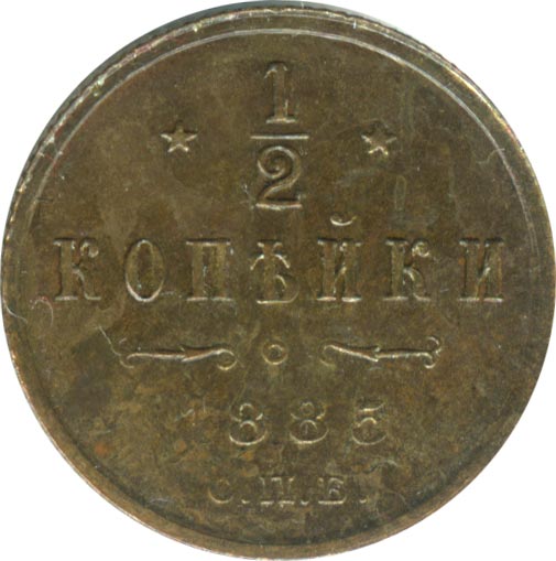 Динамика цен по монете ½ копейки 1885 СПБ „Вензель Александра III“ XF½ копейки 1885 года СПБДата выпуска: 01.01.1885 АверсВ центре вензель Александра III. Над ним Корона Российской империи с двумя развевающимися концами ленты Ордена Святого апостола Андрея Первозванного. Под вензелем, вдоль канта, две скрещенные ветви: слева лавровая, справа дубовая.РеверсВ центре указан номинал «½», ограниченный с обеих сторон звездочками. Под цифрой номинала слово — «КОПЕЙКИ». Ниже, расположен декоративный разделитель в виде двух изогнутых линий и небольшой окружности между ними. Под линиями год выпуска монеты «1885» и под ним обозначение монетного двора «С.П.Б.».Каталожные номера