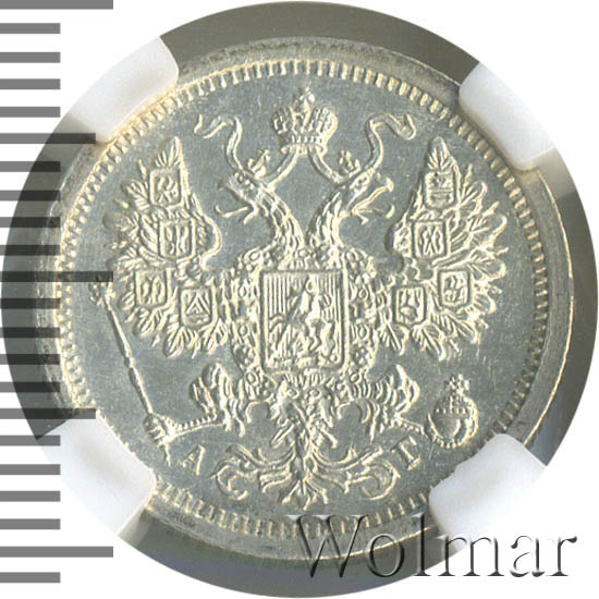 Динамика цен по монете 15 копеек 1888 СПБ АГ (Новый орел) MS15 копеек 1888 года СПБ-АГДата выпуска: 01.01.1888 АверсВ центре изображен Малый Государственный Герб Российской империи — двуглавый орёл, головы которого увенчаны двумя коронами, третья, большая корона над ними. Все они соединены орденской лентой ордена Св. Апостола Андрея Первозванного. На груди орла расположен Московский герб, в щите изображен Георгий Победоносец с копьем поражающий дракона. Вокруг щита цепь ордена Св. Апостола Андрея Первозванного. На крыльях изображены гербы: Царства Казанского, Польского, Херсонеса Таврического, Астраханского, Сибирского, Грузинского и герб соединенных княжеств Киевского, Новгородского и Владимирского — по 4 на каждое крыло. В правой лапе орла — скипетр, в левой — держава. Под правой лапой — буква «А», под левой — буква «Г». Инициалы минцмейстера Аполлона Грасгофа. По окружности канта имеются рельефные элементы, выполненные в виде зубцов.РеверсВ центре указан номинал «15», ограниченный с обеих сторон шестиконечными звездочками. Над цифрой — Корона Российской империи. Под цифрой номинала — слово «КОПЕЕК». Ниже, расположен декоративный разделитель в виде двух разнонаправленных фигурных линий и стилизованным из точек крестом между ними. Под разделителем — дата выпуска монеты «1888». Под цифрой даты — обозначение монетного двора «С.П.Б.». Вдоль канта, не доходя до короны, изображен венок из лавровой и дубовой ветви, которые в нижней части перевязаны лентой на узел бантом. По окружности канта имеются рельефные элементы, выполненные в виде зубцов.Каталожные номера