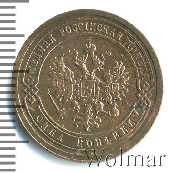 Динамика цен по монете 1 копейка 1890 СПБ AU1 копейка 1890 года СПБДата выпуска: 01.01.1890 АверсВ центре монеты изображен Малый Государственный Герб Российской империи — двуглавый орел, головы которого увенчаны двумя коронами, третья, большая корона над ними. Все они соединены лентой Андрея Первозванного. В правой лапе орла — скипетр, в левой — держава. На его груди расположен Московский герб, в щите изображен Георгий Победоносец с копьем поражающий дракона. Вокруг щита цепь ордена Св. Апостола Андрея Первозванного. На крыльях орла изображены гербы: Царства Казанского, Польского, Херсонеса Таврического, Астраханского, Сибирского, Грузинского и герб соединенных княжеств Киевского, Новгородского и Владимирского — по 4 на каждое крыло. По окружности — две полукруглые плашки, соединенные узорами. На верхней плашке выпуклая надпись: «МЕДНАЯ РОССИЙСКАЯ МОНЕТА». На нижней плашке, изображенной в виде ленты, углубленная надпись: «ОДНА КОПЕЙКА».РеверсВ центре указан номинал «1», ограниченный с обеих сторон звездочками. Под цифрой номинала слово — «КОПЕЙКА». Ниже, расположен декоративный разделитель в виде двух изогнутых линий и небольшой окружности между ними. Под линиями обозначение монетного двора «С.П.Б.». Центральная часть отделена от остального изображения, окружностью в виде точек. В верхней части по кругу углубленная надпись: «1890 ГОДА». Ниже этой надписи, вдоль канта, изображен венок из лавровой и дубовой ветви, которые в нижней части перевязаны лентой на узел бантом.Каталожные номера