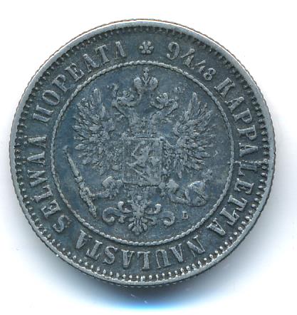 Динамика цен по монете 1 марка 1890 L „Для Финляндии“ F1 марка 1890 года LДата выпуска: 01.01.1890 АверсВ центре изображён полный Герб Великого княжества Финляндского — двуглавый орёл, головы которого увенчаны двумя коронами, третья, большая корона над ними. Все они соединены орденской лентой ордена Св. Апостола Андрея Первозванного. На груди орла расположен щит с титульным гербом Великого князя Финляндского, увенчанный княжеской короной. Вокруг щита орденская цепь с орденом Св. Апостола Андрея Первозванного. В правой лапе орла — скипетр, в левой — держава. Под левой лапой знак директора Гельсингфосского монетного двора — литера «L», Johan Conrad Lihr (Йохан Конрад Лир). Вокруг центрального изображения — витой ободок. За ободком круговая надпись: «94.48 KAPPALETTA NAULASTA SELWÄÄ HOPEATA», сверху разделённая цветочной розеткой. По окружности канта имеются рельефные элементы, выполненные в виде зубцов.РеверсВ центре — надпись в три строки: «1"│"MARKAA"│"1890». Вдоль канта изображён не замкнутый венок из двух дубовых ветвей, которые, в нижней части, перевязаны лентой на узел двойным бантом. По окружности канта имеются рельефные элементы, выполненные в виде зубцов.Каталожные номера