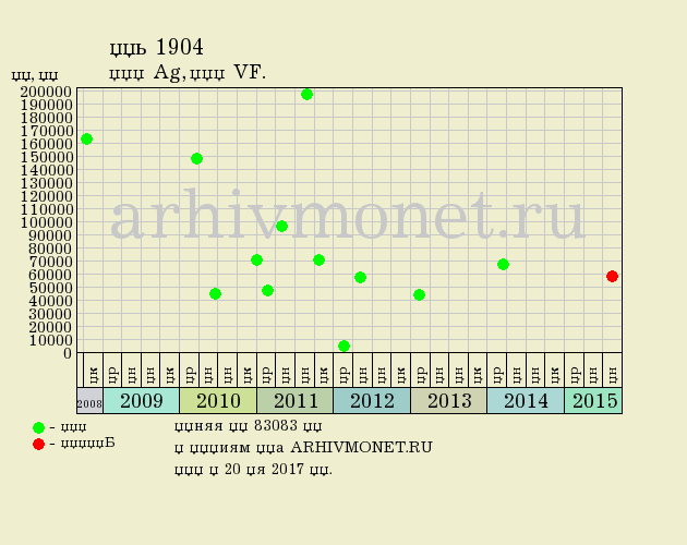 Средняя цена: 83083 рублей (по 13 лотам). Торги по представленной на фото монете состоялись на аукционе Аукцион.СПБ 16 сентября 2015 года. Достигнутая цена на торгах: 59161 рублей.