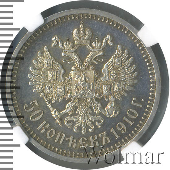 50 копеек 1910 года ЭБДата выпуска: 01.01.1910 АверсВ центре профильный портрет влево императора Николая II. Слева надпись «Б.М. НИКОЛАЙ II ИМПЕРАТОР», справа — «И САМОДЕРЖЕЦ ВСЕРОСС.». По окружности канта имеются рельефные элементы, выполненные в виде зубцов.РеверсВ центре изображен Малый Государственный Герб Российской империи — двуглавый орёл, головы которого увенчаны двумя коронами, третья, большая корона над ними. Все они соединены орденской лентой ордена Св. Апостола Андрея Первозванного. На груди орла расположен Московский герб, в щите изображен Георгий Победоносец с копьем поражающий дракона. Вокруг щита цепь ордена Св. Апостола Андрея Первозванного. На крыльях изображены гербы: Царства Казанского, Польского, Херсонеса Таврического, Астраханского, Сибирского, Грузинского и герб соединенных княжеств Киевского, Новгородского и Владимирского — по 4 на каждое крыло. В правой лапе орла — скипетр, в левой — держава. Под ним слева направо изображены: номинал — надпись «50 копеек» и дата выпуска «1910 Г.». По окружности канта имеются рельефные элементы, выполненные в виде зубцов.Каталожные номера