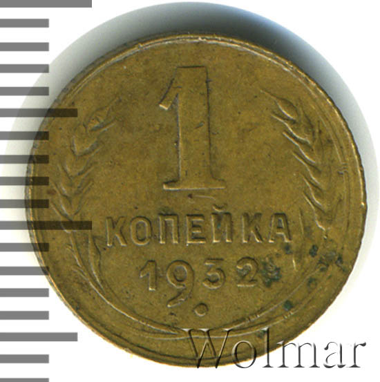 Динамика цен по монете 1 копейка 1932 VF1 копейка 1932 годаДата выпуска: 01.01.1932 АверсШтемпель 1.2. земной шар плоский, между рукоятью молота и рукоятью серпа проходят две параллели, герб СССР — 7 витков ленты. Штемпель 2. запятая в круговой надписи касается ободка, герб СССР — 7 витков ленты. РеверсШтемпель от, А до В. Каталожные номера