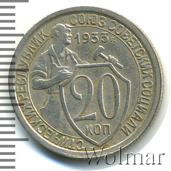 Динамика цен по монете 20 копеек 1933 - „Со щитом“ XF20 копеек 1933 годаДата выпуска: 01.01.1933 АверсШтемпель 1.1. у ближнего к земному шару колоса справа одна длинная ость, герб СССР — 7 витков ленты. Штемпель 1.2. у ближнего к земному шару колоса справа две короткие ости, герб СССР — 7 витков ленты. РеверсШтемпель Ф-20. Каталожные номера