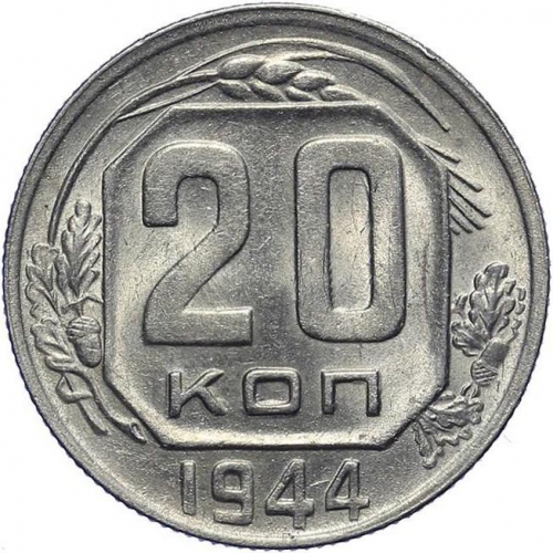 Динамика цен по монете 20 копеек 1944 - „Венок 11 лент“ AU20 копеек 1944 годаДата выпуска: 01.01.1944 АверсШтемпель 1.21. к левому нижнему лучу звезды подходят 6 плохо гравированных остей, герб СССР — 11 витков ленты. РеверсШтемпель Ф-44. Каталожные номера