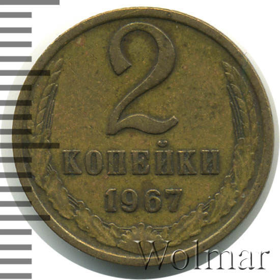 Динамика цен по монете 2 копейки 1967 VFРазменные монеты номиналом 2 копейки 1961 - 1991Двухкопеечный номинал периода позднего Советского Союза изготовлен из сплава меди и цинка — он отчеканен на кружке металла диаметром 18 миллиметров. Все изображения и тексты выступают на фоне основного диска монеты. По периметру дензнака имеется двусторонний гладкий выступающий кант. Аверс. Его можно назвать стандартным для всех монет этого периода — в центре помещен герб Советского Союза, под которым располагается надпись СССР. Реверс. Пшенично-дубовый венок, распростертый с нижнего края монетки вверх. В центре помещена дата чеканки в цифровом отображении. Номинал находится вверху — он прописан буквами и цифрами (2 копейки). Гурт у монетки рубчатый. Вес согласно нормативу составляет 2 грамма. За весь период чеканки монетка вышла огромным тиражом — она встречается в трех различных вариациях. |